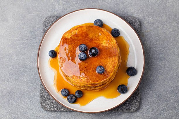 Pancakes are soft , circular and fresh, it is prepared with a smooth batter on a hot pan .they are easy to eat and satisfy your cravings of sweets, blue berries shown in image gives a juicy taste.